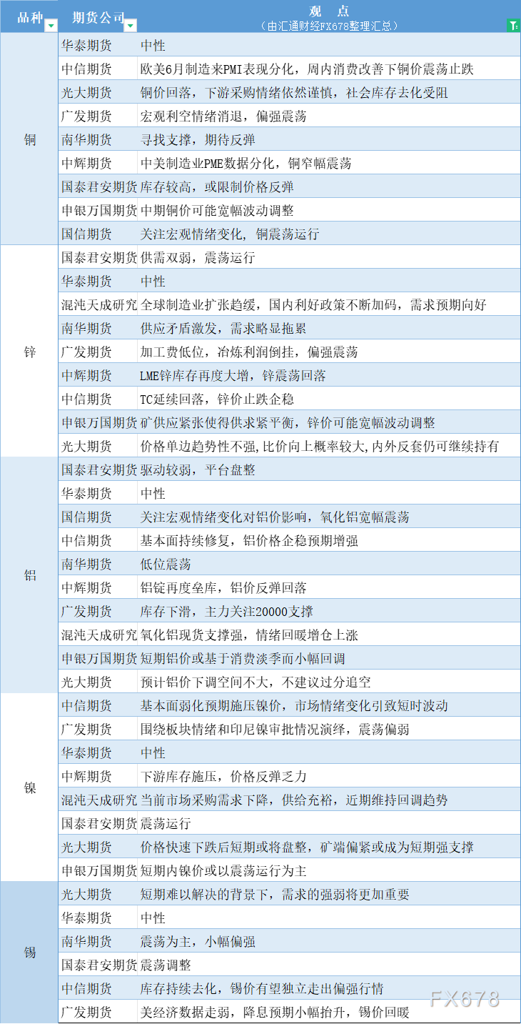 期货公司观点汇总一张图:7月2日有色系(铜、锌、铝、镍、锡等)