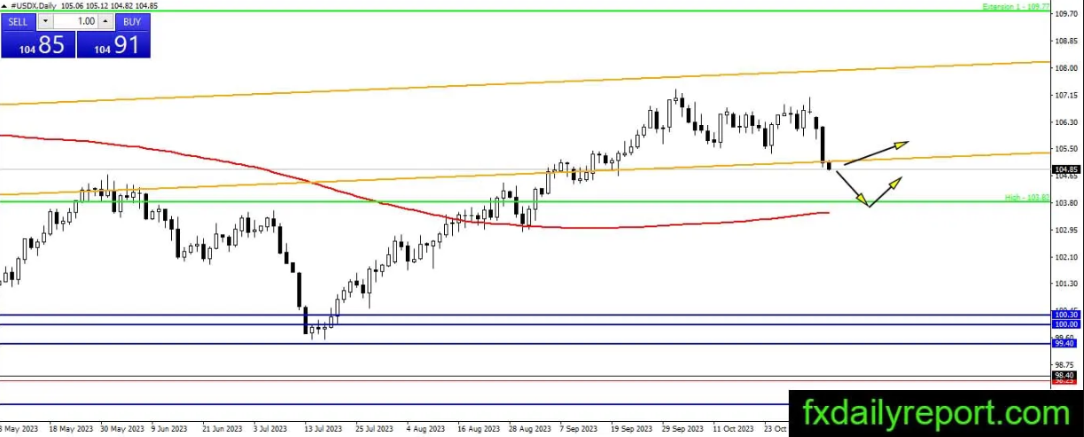 美元指数上周末大幅下跌,证实了中长期趋势方向的改变。该指数仍有走弱的可能,下跌目标为103.85点。200日移动平均线将成为交易者进行看跌测试的重点。如果指数能够反弹,那么短期趋势就会发生变化。如果美联储明年决定降息,美元指数将继续走弱。