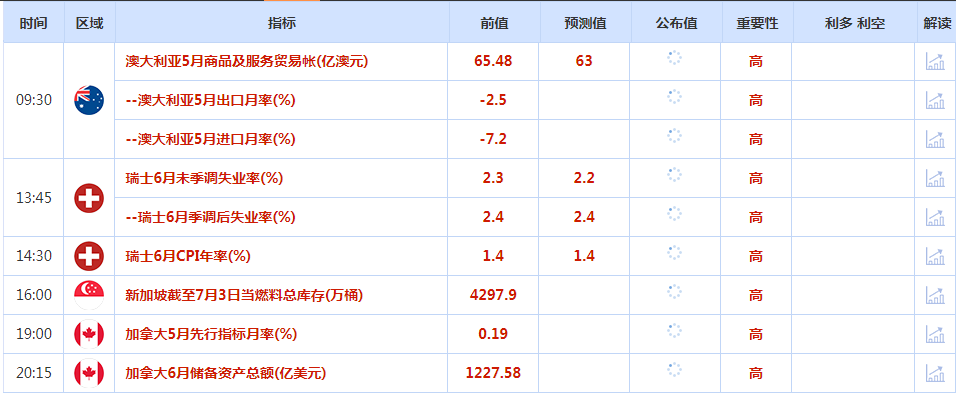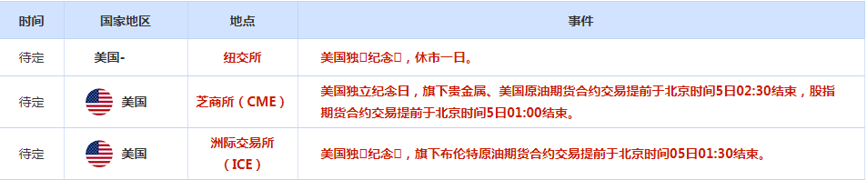 本交易日是美国独立日假期,美国市场休市,CME旗下贵金属期货合约交易提前于北京时间7月5日02:30结束,美国经济数据已经提前至周三公布,市场交投可能受到限制。