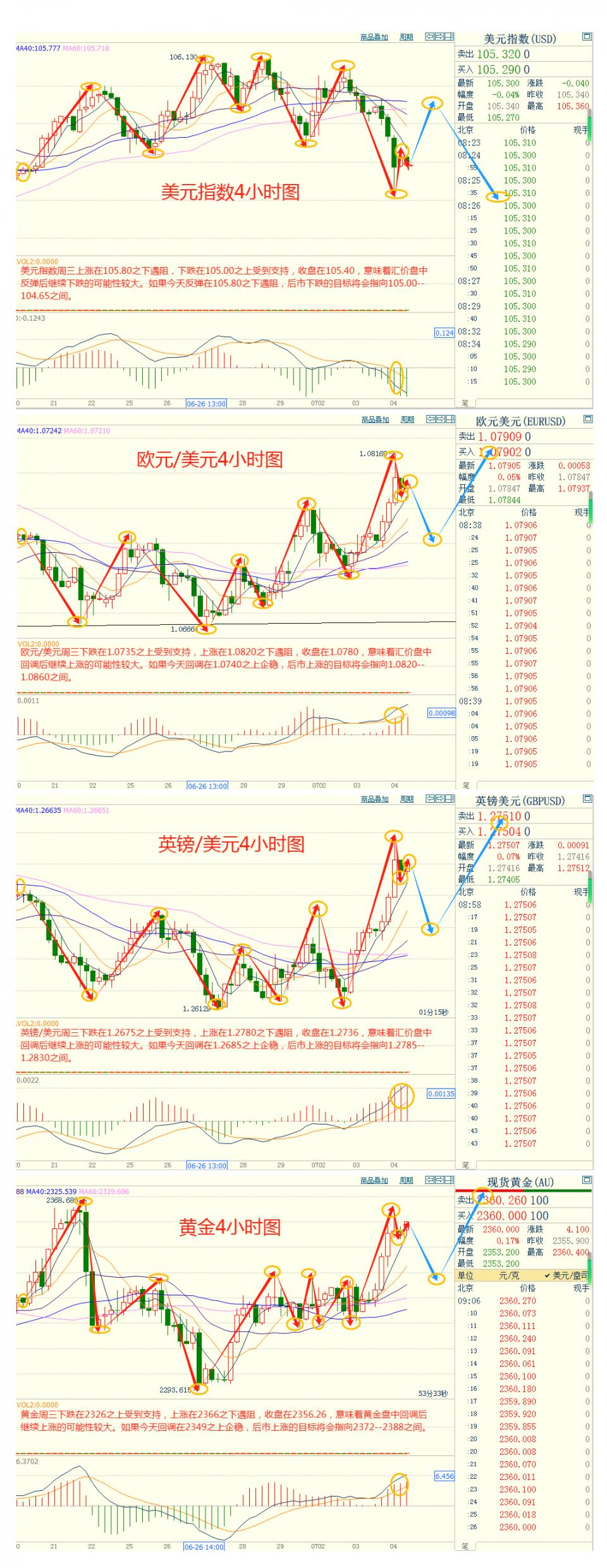 美指周三上涨在105.80之下遇阻,下跌在105.00之上受到支持,意味着美元短线上涨后有可能保持下跌的走势。如果美指今天上涨在105.80之下遇阻,后市下跌的目标将会指向105.00--104.65之间。今天美指短线阻力在105.75--105.80,短线重要阻力在106.15--106.20。今天美指短线支持在105.00--105.05,短线重要支持在104.65--104.70。