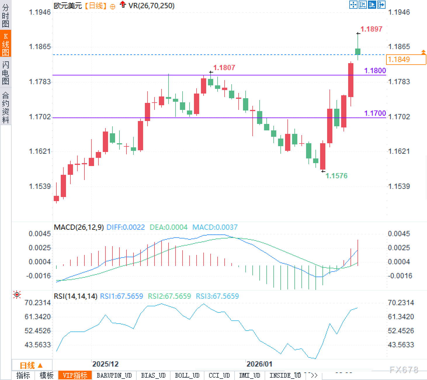 指标方面,日线相对强弱指标已升至67.5659,接近超买区间,提示进一步追高需警惕震荡加剧的风险。MACD方面,DIFF为0.0022,DEA为0.0004,柱状图动能为0.0037,虽仍显示多头占优,但在高位运行时容易出现动能衰减引发的技术性回撤。综合来看,在基本面尚未出现明确单边驱动前,欧元兑美元更可能维持强势震荡格局,交易员关注美联储表态变化及2月非农数据对利差预期的再定价。